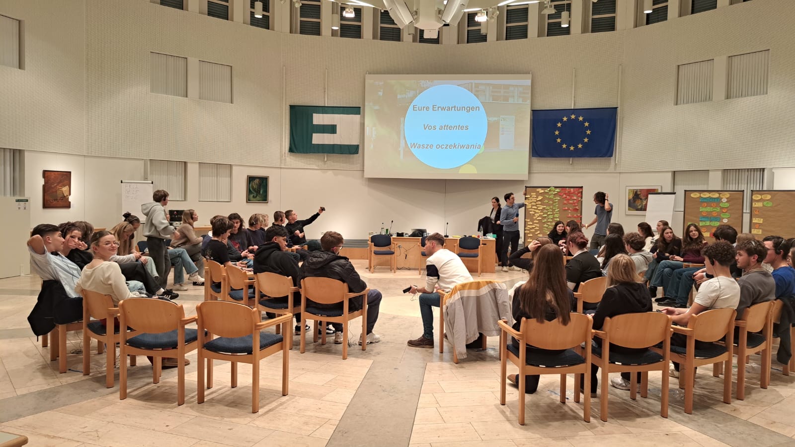 Grâce à des jeux, des ateliers, une soirée interculturelle et une excursion à Strasbourg, organisés par les animateurs linguistiques de l’Académie européenne, les 45 participants issus des trois pays ont pu, tout au long de la semaine, faire connaissance, échanger, réfléchir et coopérer autour de thématiques variées telles que le changement climatique, la jeunesse en Europe, les migrations, la position de l’Union européenne dans le monde et la guerre en Ukraine.